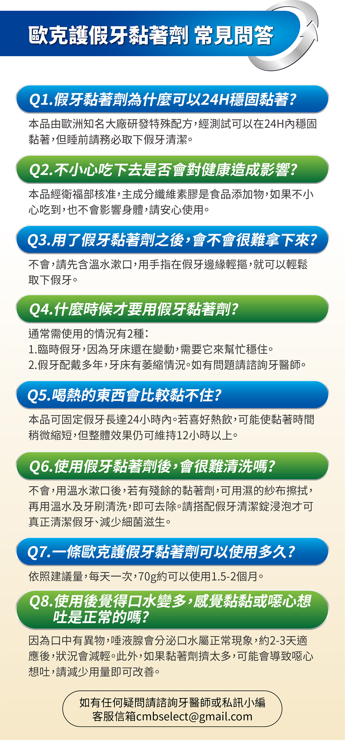 假牙經使用本產品後,應每日取下清潔及更換黏著劑。