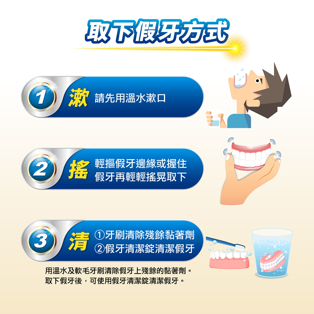 如果在您取下假牙後,牙齦上仍殘留任何黏著劑,請用温水漱口或用牙膏輕輕刷洗牙齦。