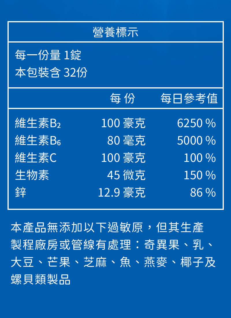 維生素B2、維生素B6、維生素C、生物素、葡萄糖酸鋅、硬脂酸鎂、沖繩苦瓜粉末
